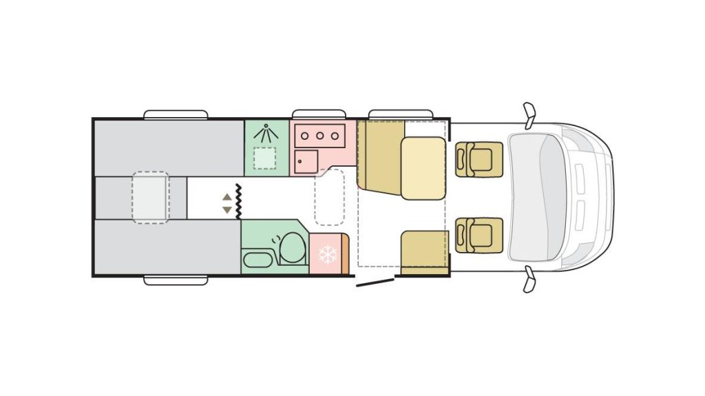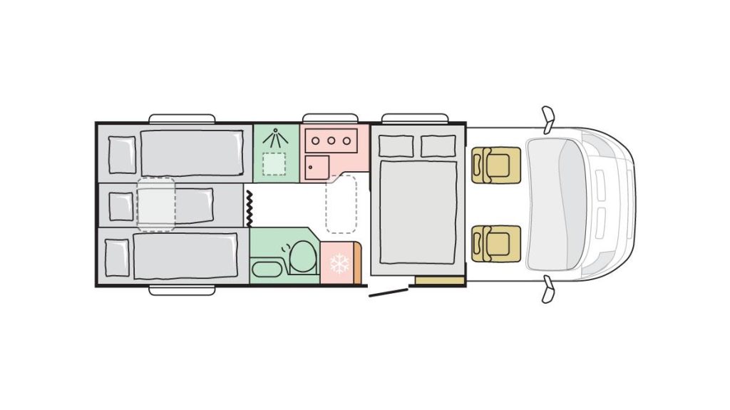 - Střešní okno 700×500 mm nad zadním dvojlůžkem